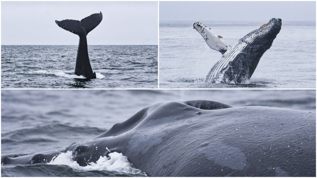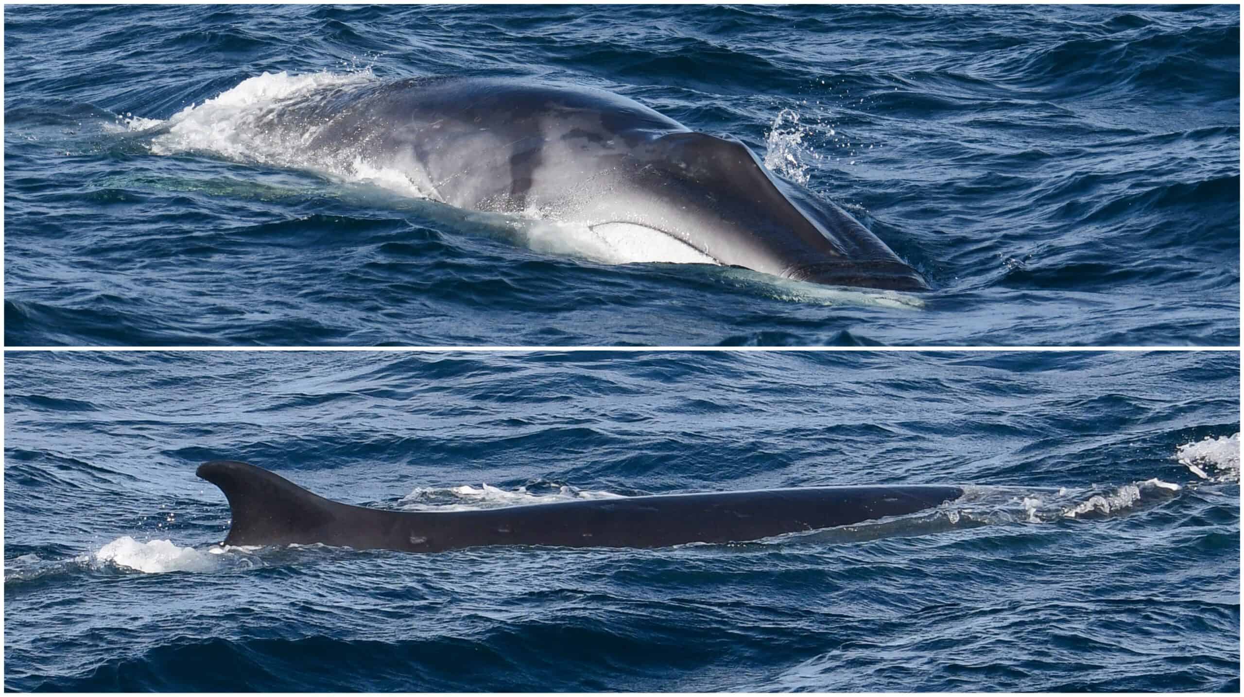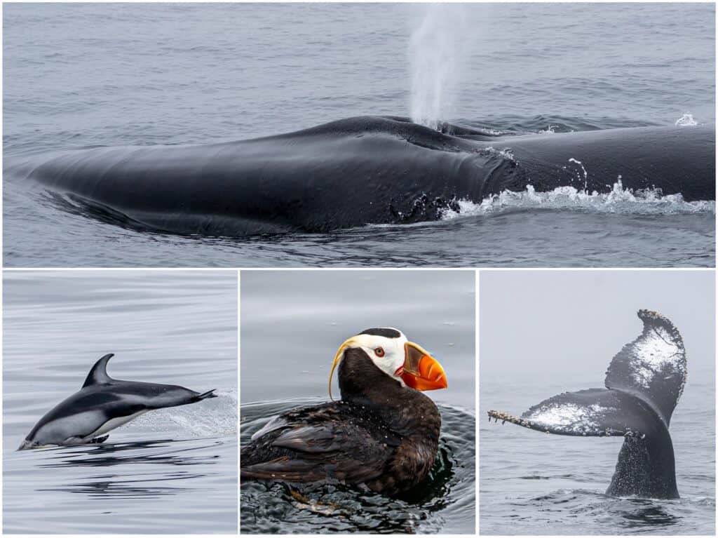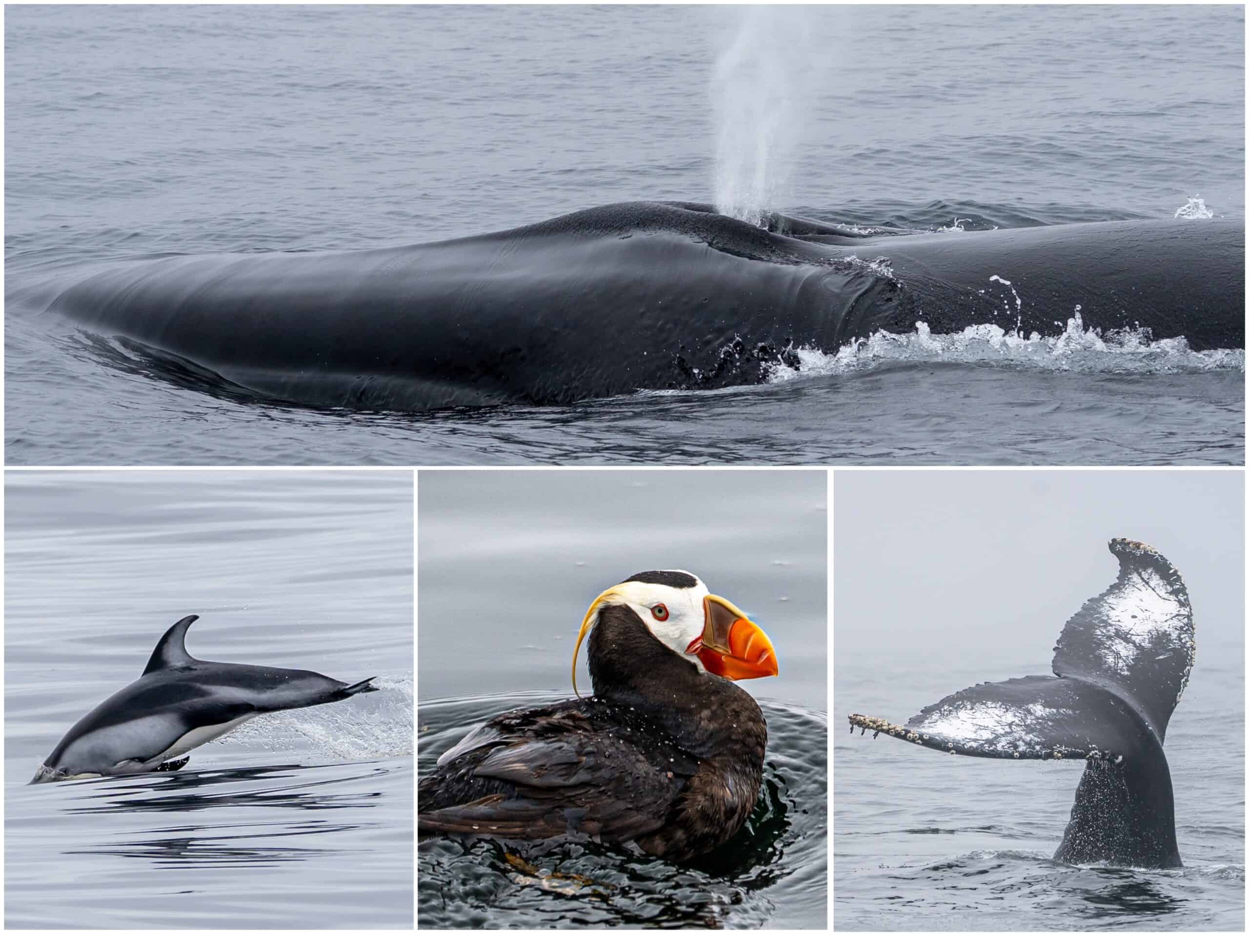 Fin whale (top). White-sided dolphin | Tufted Puffin | Humpback whale (bottom left to right). Photos like these are included in your ticket price!