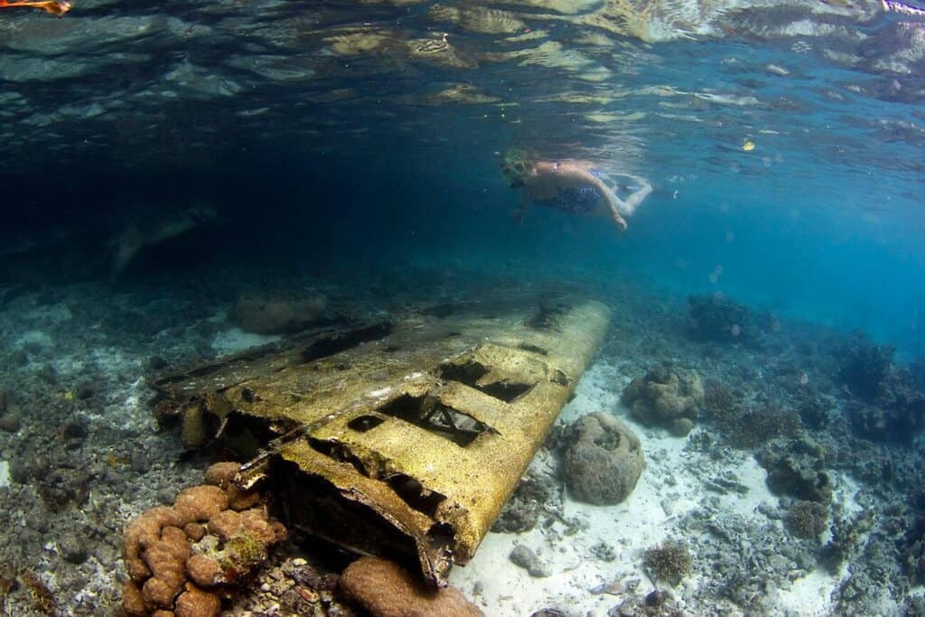Snorkelers can examine the underwater ruins of WWII-era planes in Palau’s Rock Islands. © Keoki Stender