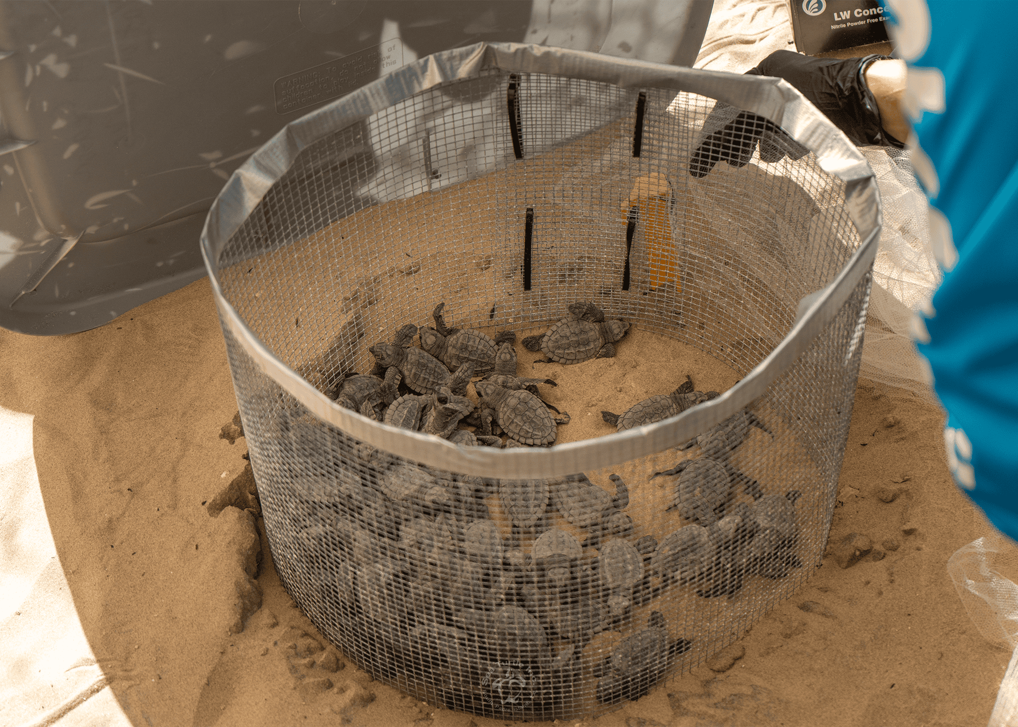 Sea Turtle, Inc. protects sea turtle nests in a hatchery to increase the chances that the eggs will develop into hatchlings.