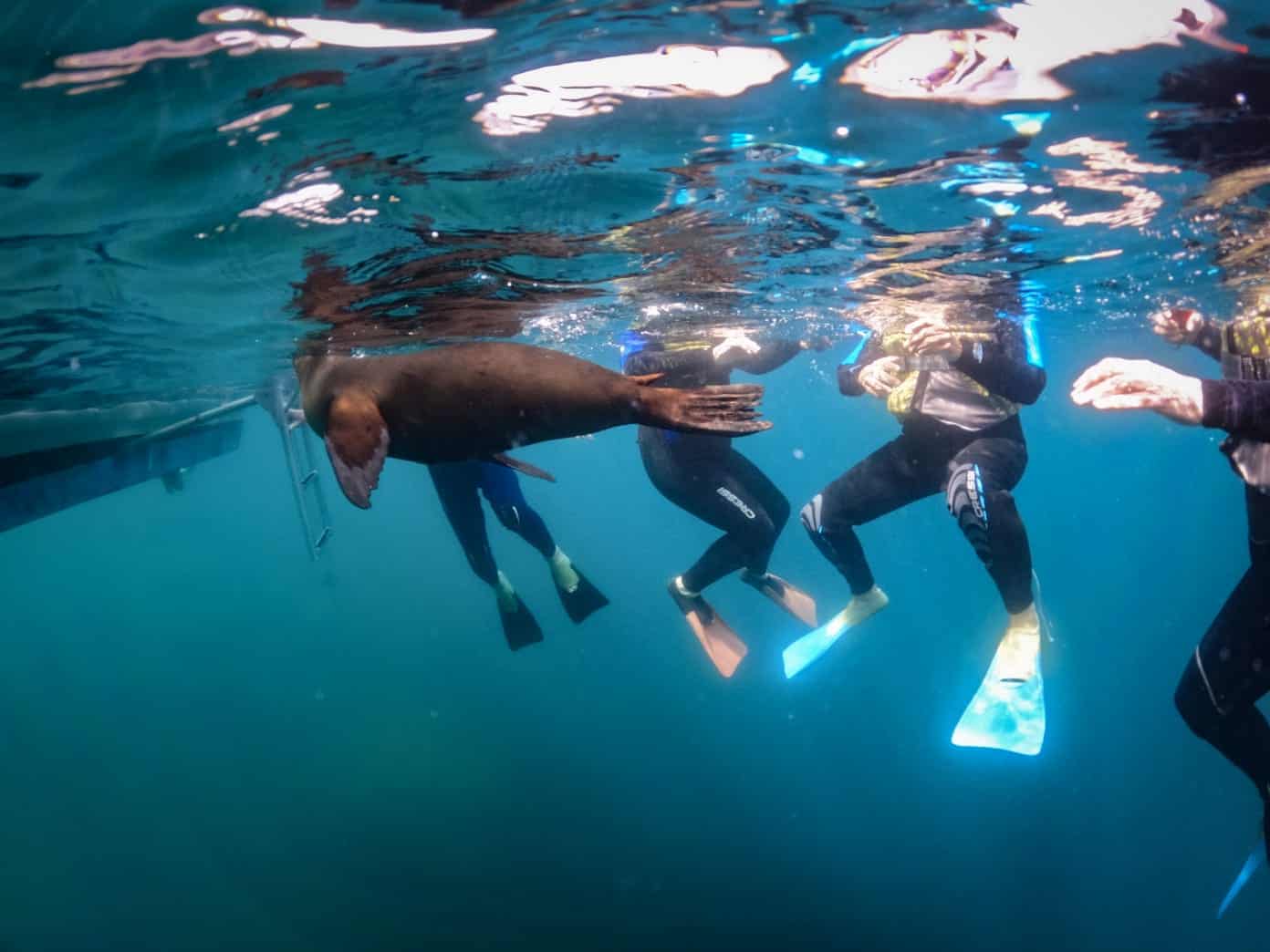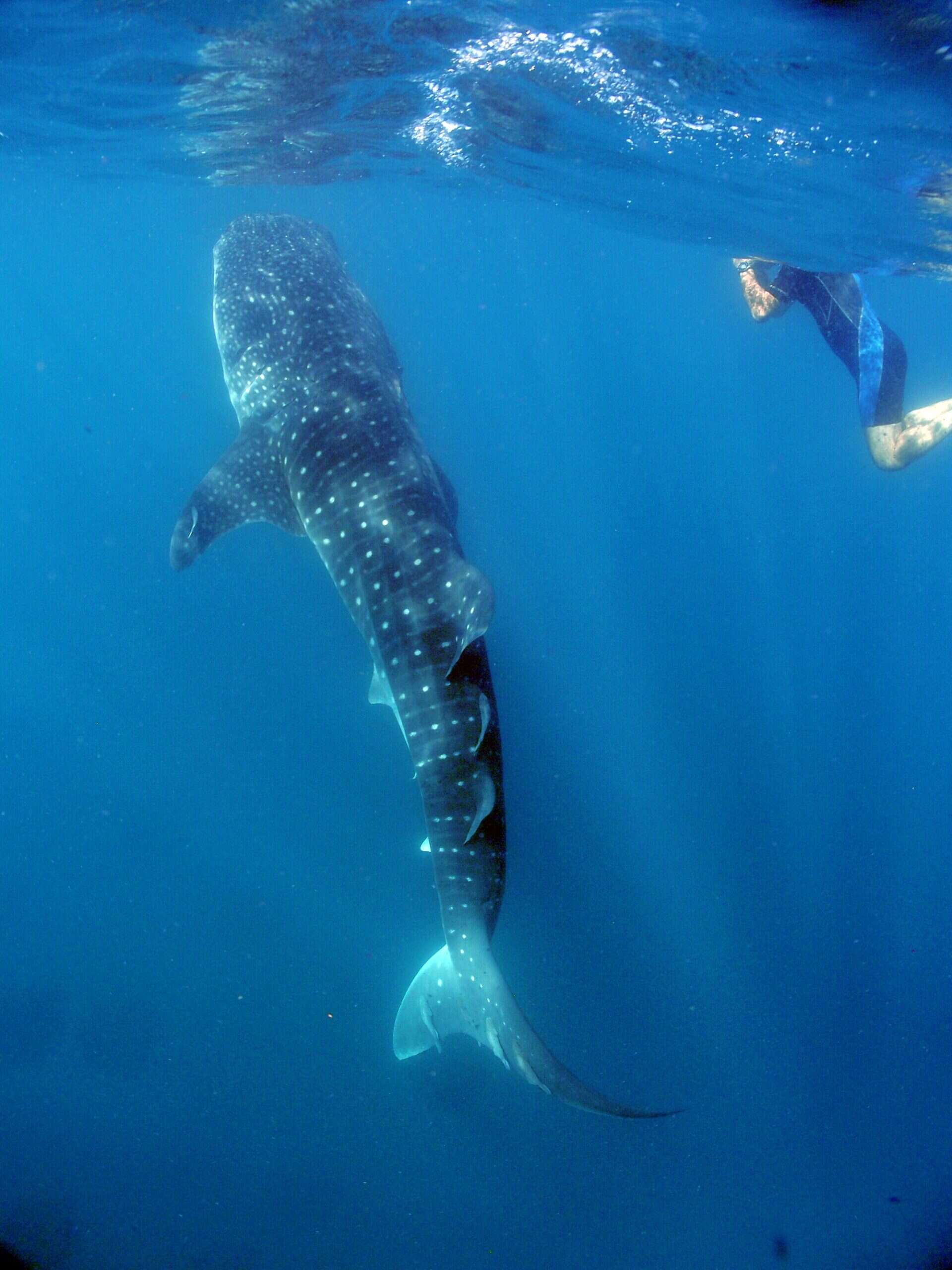 Our first day at sea in La Paz was the best wildlife watching day I have had in my life. We had the chance to snorkel with a whale shark four times, then a magnificent close encounter (their choice – one mouthed my fin!) with sea lions at Espiritu Santo, and on the way home our boat was surrounded by about 100 leaping common dolphins. We also saw baby pelicans and a blue footed booby, some lovely soft coral/sea plumes, and a few interesting fish. Simply wonderful.