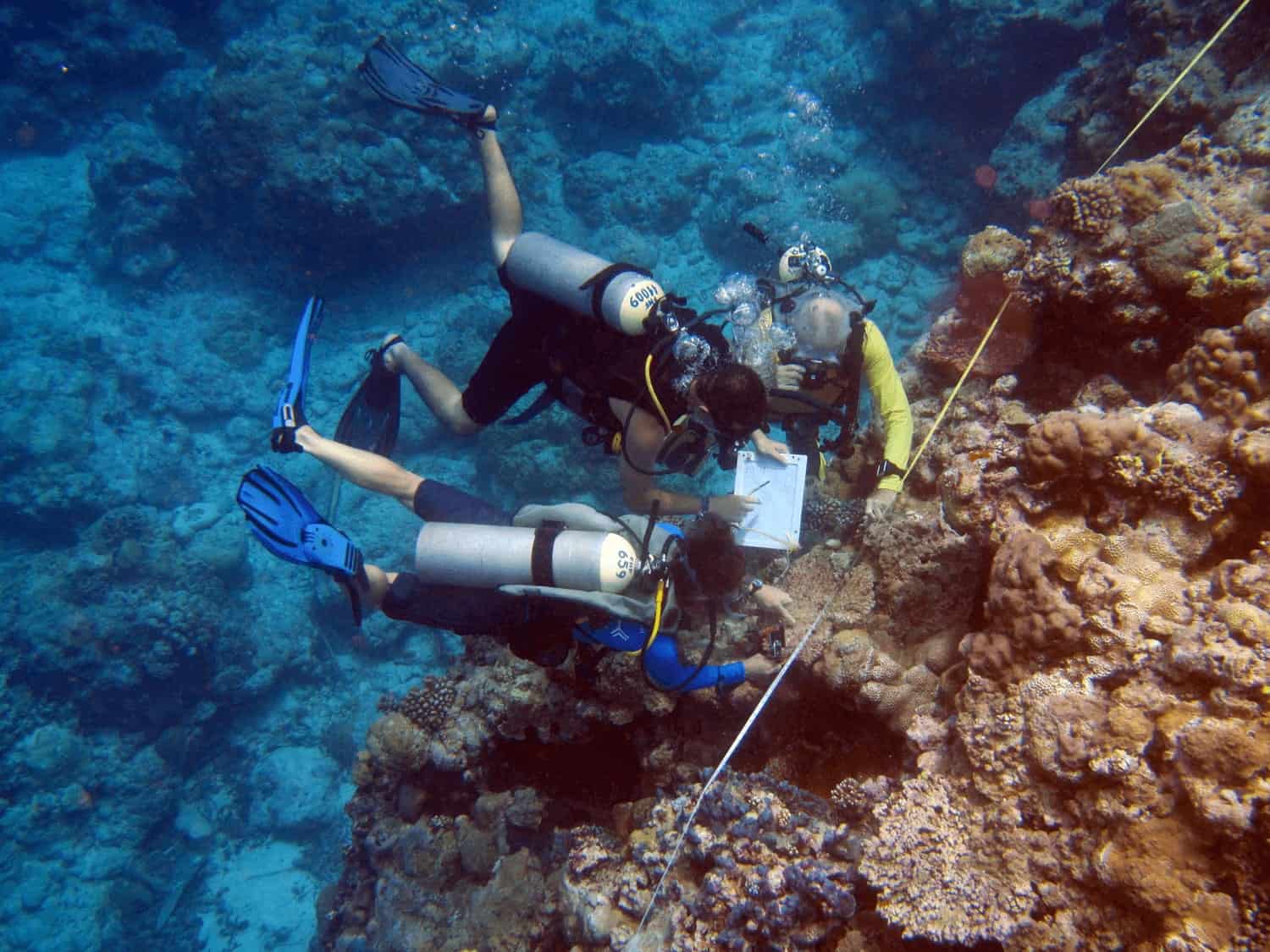 Support marine research by collecting data on coral reef health and fish biodiversity in areas with varying shark populations.