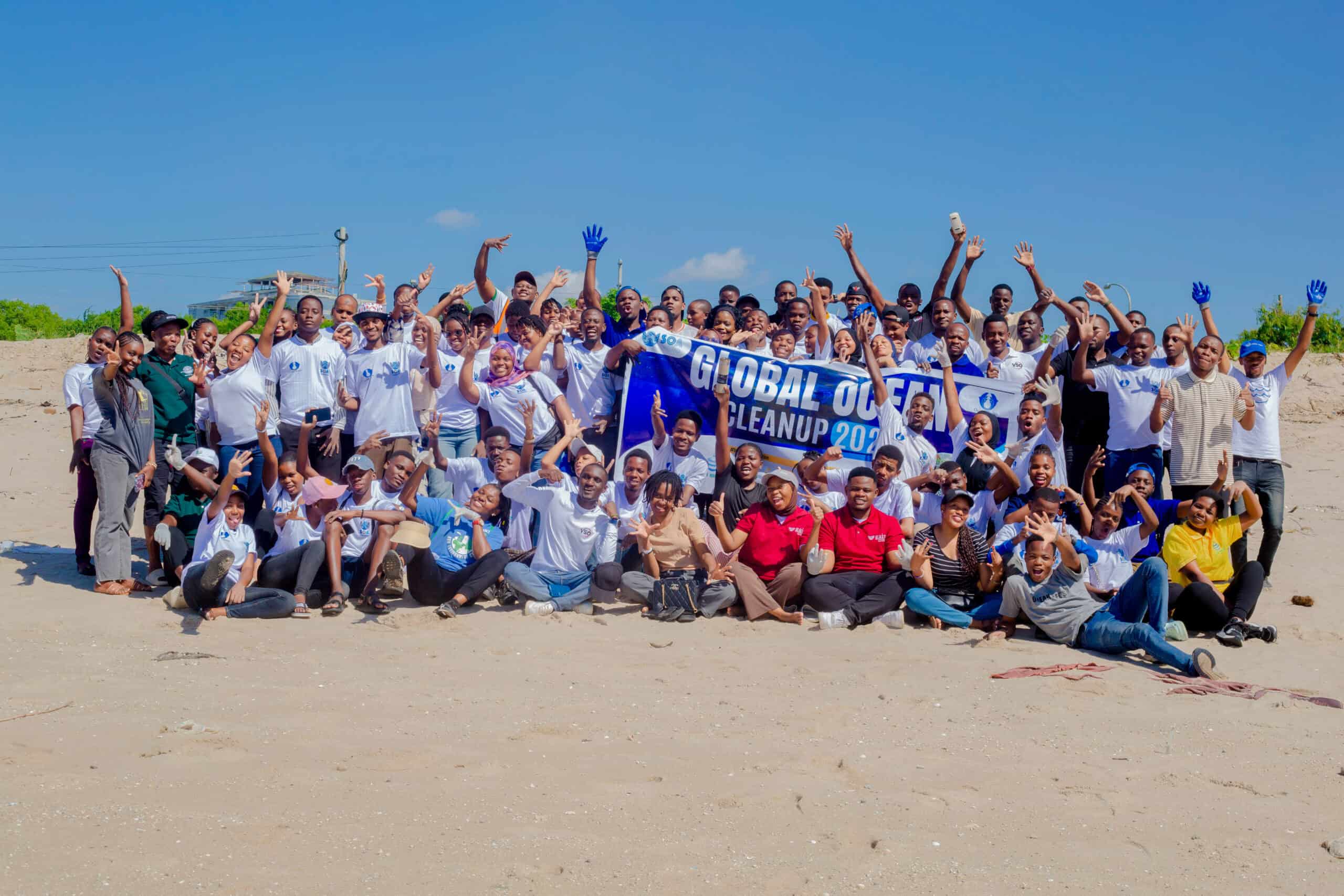 Volunteers with Sustainable Ocean Alliance in Tanzania gather for a group photo after collecting debris for their local Global Ocean Cleanup 2025.